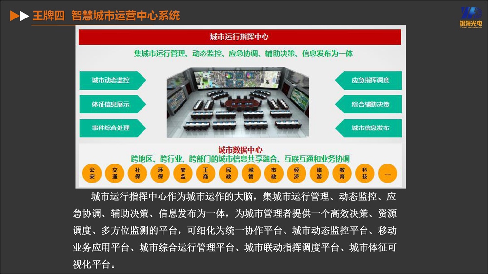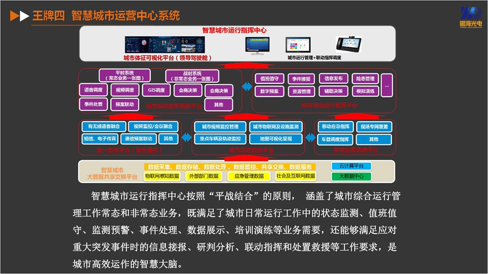 智慧城市作為數(shù)字中國(guó)的核心載體是各地重塑發(fā)展新優(yōu)勢(shì)、搶占競(jìng)爭(zhēng)制高點(diǎn)的戰(zhàn)略選擇。 構(gòu)建智慧城市,科技創(chuàng)新加持。廣東銀海光電科技有限公司是一家與中科院、深圳科技型上市公司深度合作及作為強(qiáng)大技術(shù)支撐的科創(chuàng)型企業(yè),其打造三大平臺(tái),手握“三張王牌”,為政府、央企、大型國(guó)企等量身打造風(fēng)險(xiǎn)